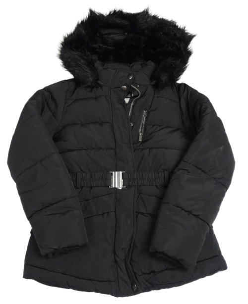 • Čierna prešívaná šušťáková zimná bunda s kapucňou s kožešinou a opaskom C&A