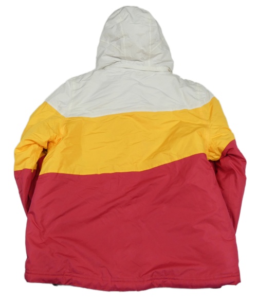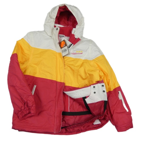 Nové - bielo-tmavožluto-malinová šušťáková zimná lyžiarska bunda s nápisem odopínacíá kapucňou active