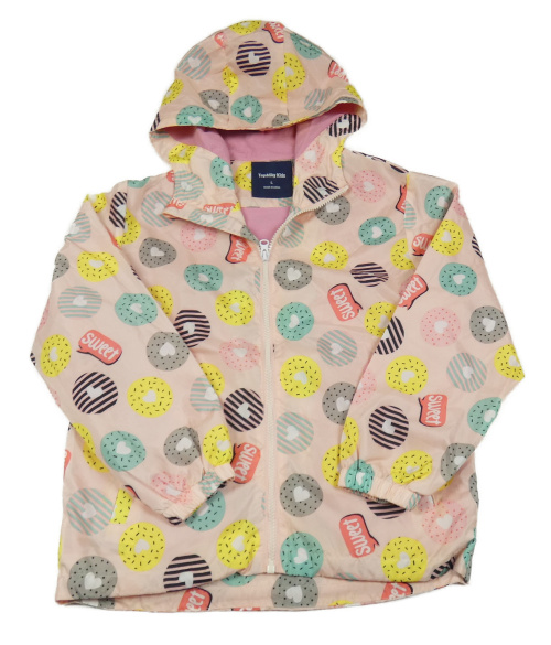Svetloružová šušťáková jarná bunda s donuty a kapucňou