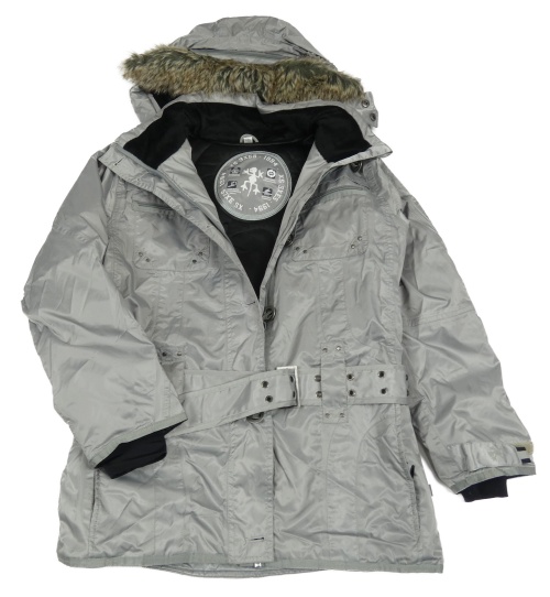 Sivá šušťáková zateplená bunda s opaskom a kapucňou