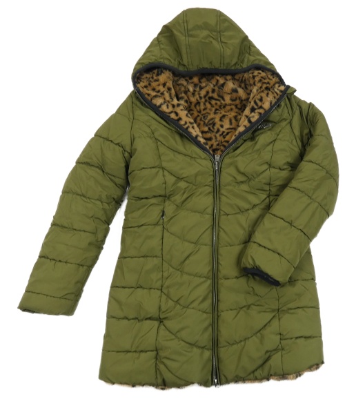 Hnedo-čierna leopardí kožušinová obojstranná zimná bunda s kapucňou Vidigo