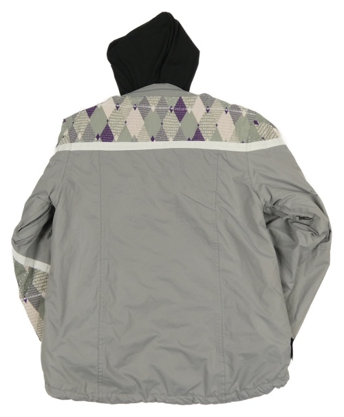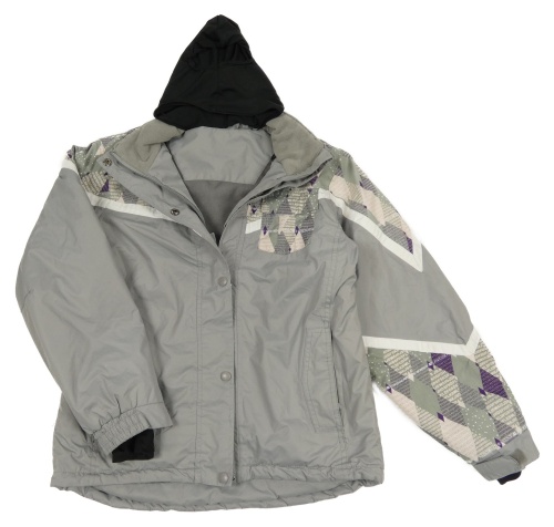 Sivá šušťáková zimná lyžiarska bunda s potlačou a kuklou