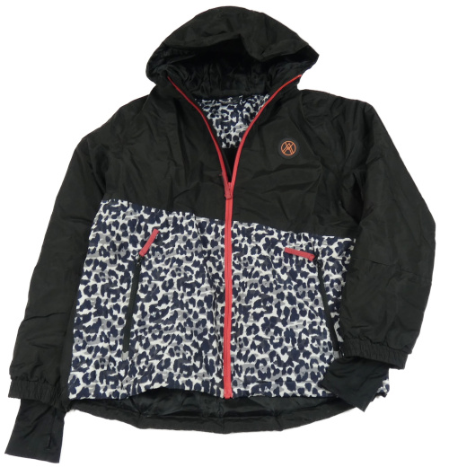 Čierno-sivo-biela šušťáková zimná lyžiarska bunda s nášivkou a vzorom a kapucňou crivit