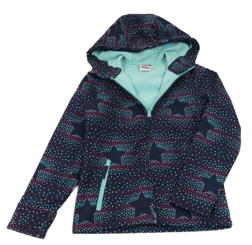 • Tmavomodro-světlemodro-ružová bodkovaná á softshellová bunda s hviezdami a kapucňou Yigga
