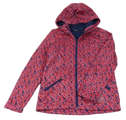 Jahodová bodkovaná á softshellová bunda s kvetmi a nápismi a kapucňou crivit