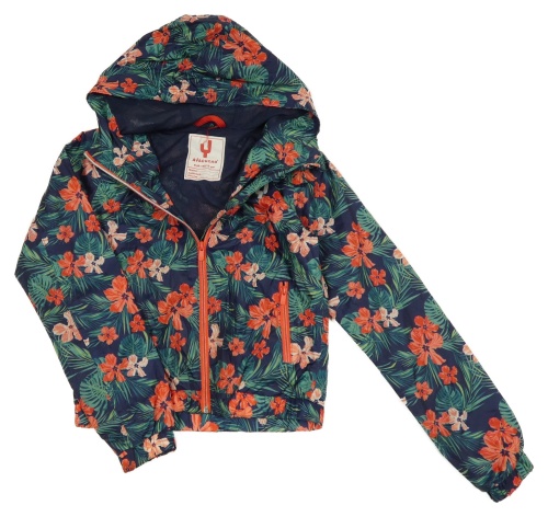 Tmavomodro-zeleno-ružová kvetovaná šušťáková crop jarná bunda s kapucňou