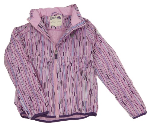 Ružovo-modrá pruhovaná šušťáková jarná bunda s ukrývací kapucňou