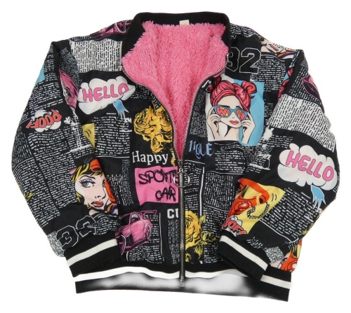 Černý šusťákový zateplený bomber s nápismi a dievčatkom