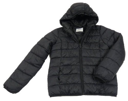 • Čierna prešívaná šušťáková prechodná bunda s kapucňou