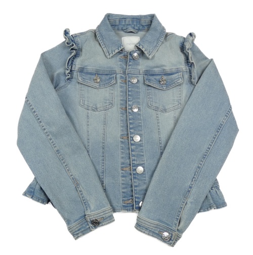 Svetlomodrá tepláková rifľová crop bunda s volánikmi a golierikom Next