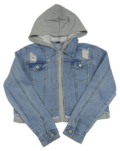 Světlemodro-sivá riflovo/tepláková crop bunda s vyšúchaním a kapucňou SHEIN