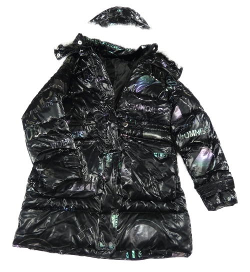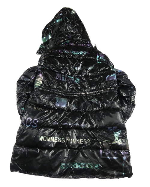 Čierny šušťákový zimný kabát s nápismi a kapucňou