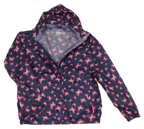 • Tmavomodrá šušťáková nepromokavá funkčná bunda s motýlikmi a ukrývací kapucňou gelert