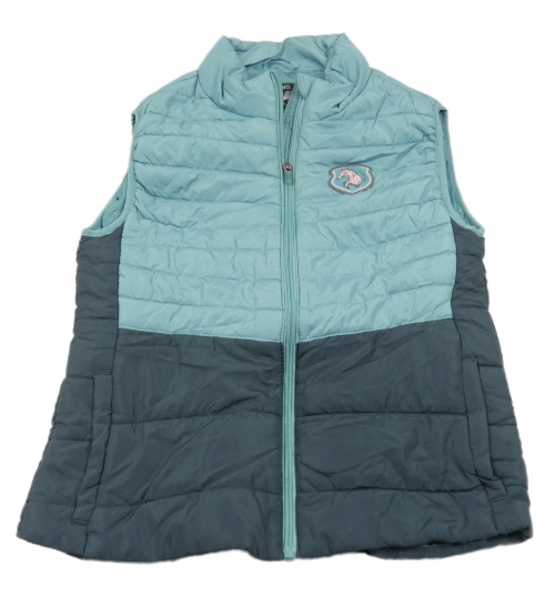 Modro-sivá šušťáková prešívaná zateplená vesta s nášivkou