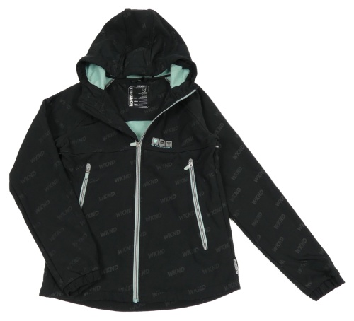 Čierna softshellová bunda s nápismi a kapucňou C&A