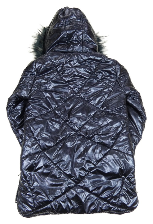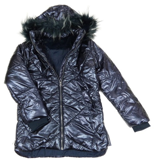 • Nové - tmavomodrý lesklý prešívaný šušťákový zimný kabát s kožešinou st.