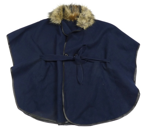 Tmavomodré flaušové pončo s opaskom a kožušinovým golierom