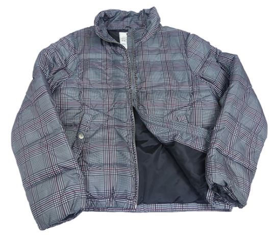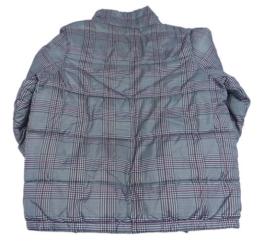 Čierno-tmavošedo-bielo-vínová kockovaná vzorovaná prešívaná šušťáková zimná bunda