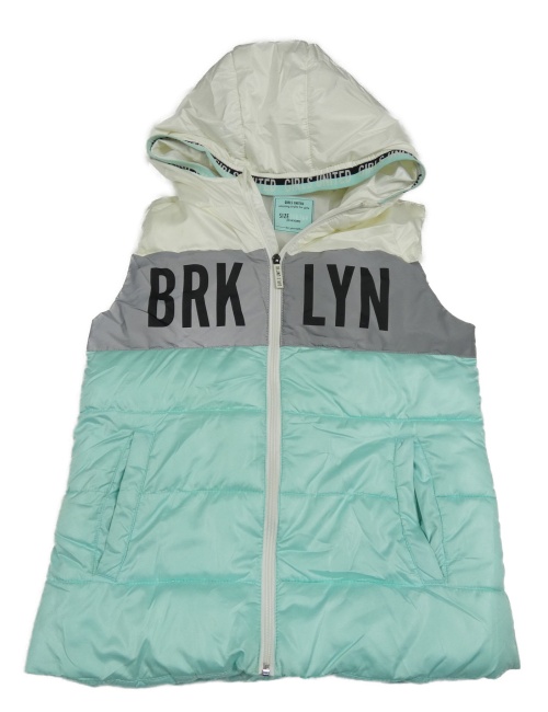 Mintovo-smetanovo-sivá šušťáková zateplená vesta s nápisom a kapucňou