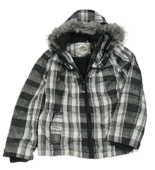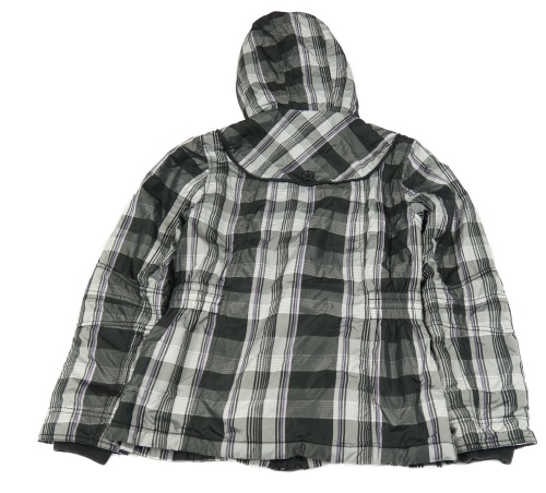 Čierno-sivo-fialová kockovaná šušťáková zimná bunda s kapucňou