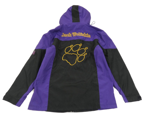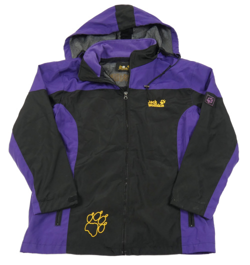 • Fialovo-čierna šušťáková jarná funkčná bunda s logom a kapucí Jack Wolfskin vel. 176