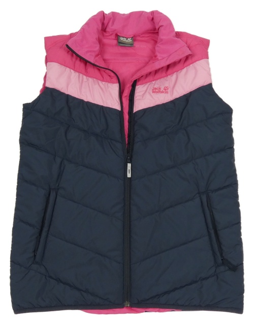 Tmavomodro-ružová šušťáková zateplená vesta s logom Jack Wolfskin