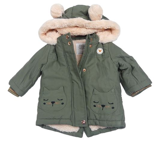 Khaki šušťáková zimná parka s mačkami a kapucňou F&F