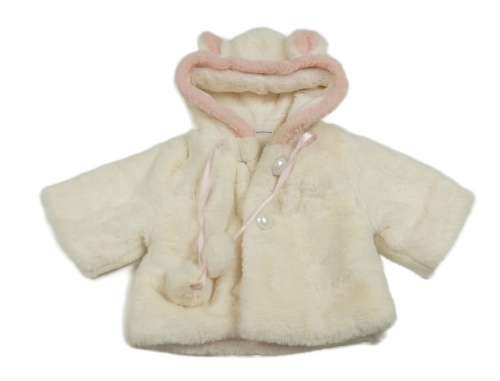 Smotanový kožušinový zateplený kabát s bambulemi a kapucňou s uškami