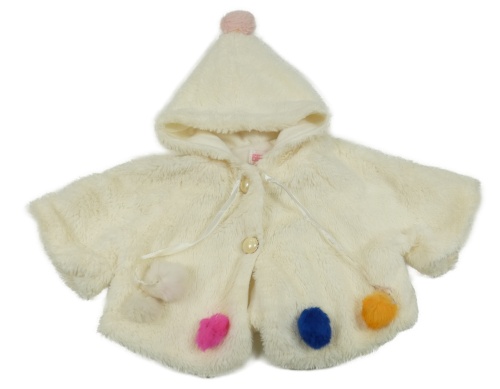 Smotanová kožušinová podšitá bunda s bambulkami a kapucňou