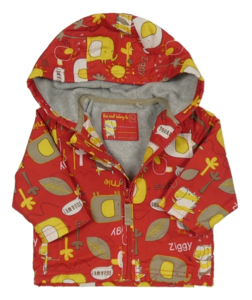 Červená šušťáková jarná bunda so zvířátky a s kapucňou