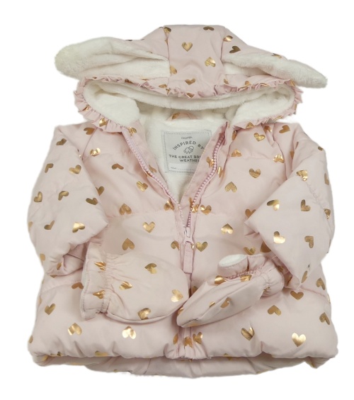 • Svetloružová prešívaná šušťáková zimná bunda so zlatými srdiečkami a kapucňou s oušky + rukavice George