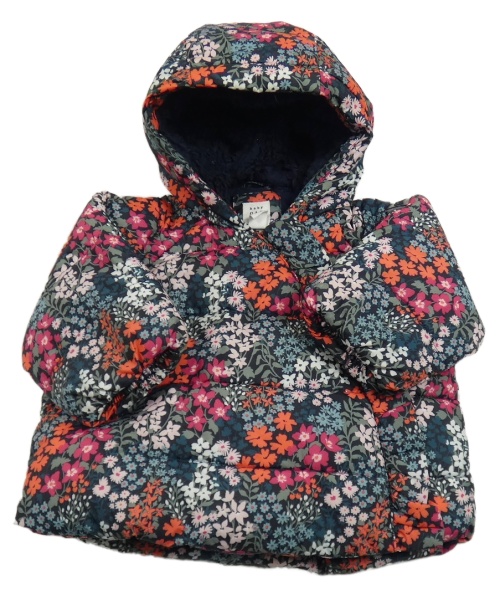 • Tmavomodrá prešívaná šušťáková zimná bunda s kvietkami a volánikom a kapucňou GAP