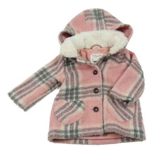 Ružovo-sivo-biely kockovaný vlnený podšitý kabát s kapucňou C&A