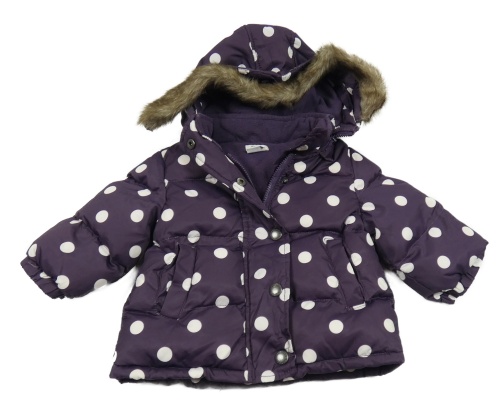 • Fialovo-biela bodkovaná á šušťáková zimná bunda s kapucňou s kožešinou Mamas&Papas