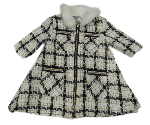 Smetanovo-čierno-zlatý kockovaný vzorovaný podšitý kabát s kamienkami a retiazkou a kožušinovým golierikom BLUE BERi