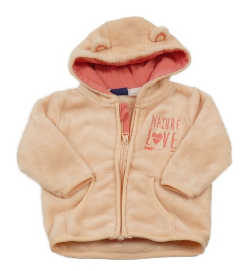 Marhuľová plyšová bunda s nápisy a šípom a kapucňou s uškami lupilu