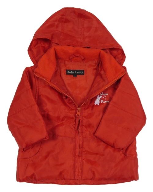• Červená šušťáková jarná zateplená bunda so zajačikom a nápismi a ukrývací kapucňou