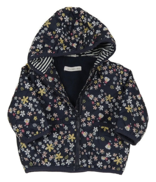 Tmavomodro-kvetovaná šušťáková prešívaná zateplená bunda s kapucňou