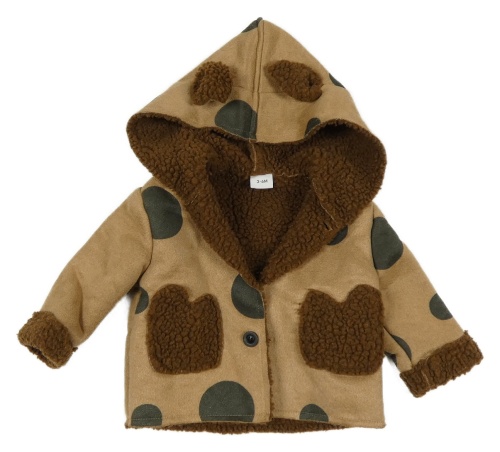 Hnědý puntíkatý semišový zateplený kabátek s kapucňou s uškami