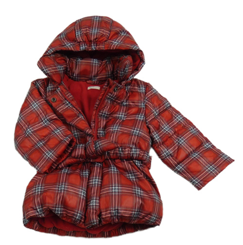 • Červeno-bielo-čierny kockovaný šušťákový zimný kabát s opaskom a kapucňou Benetton