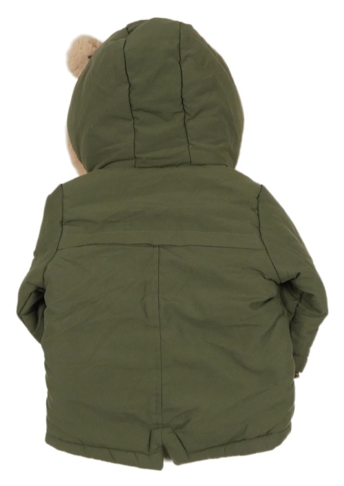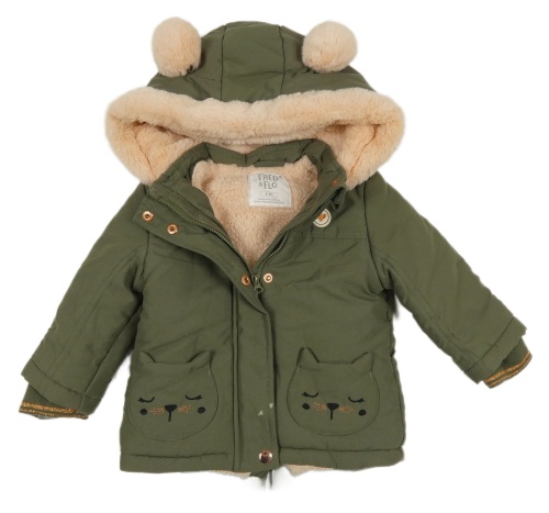 • Khaki šušťáková zimná parka s kočičkami/kapsami a srdiečkami a kapucňou s kožešinou a bambulemi F&F