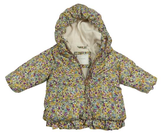 • Smetanovo-farebná kvietkovana prešívaná šušťáková zimná bunda s volánikom a kapucňou Next