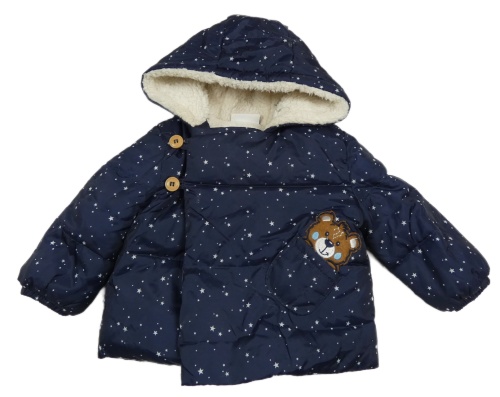 • Tmavomodrá prešívaná šušťáková zimná bunda s medvedíkom a hviezdičkami a kapucňou orsolino