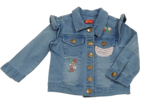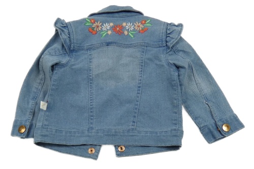 Modrá rifľová bunda s kvietkami a volánikmi