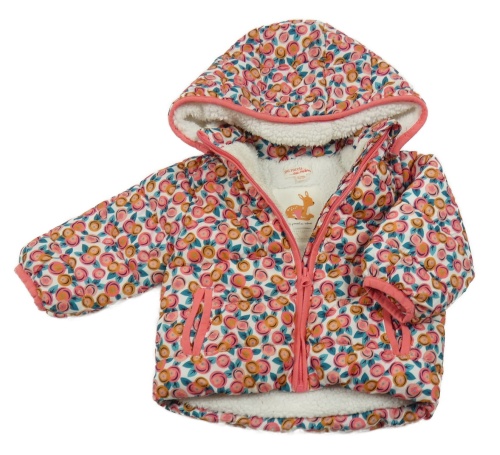 uvnitř huňatá podšívka - polyester, růžové lemy u rukávů a kapuce