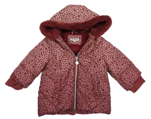 • Starorůžovo-vínová bodkovaná á prešívaná šušťáková zimná bunda so srdiečkami a kapucňou s kožešinou S. Oliver