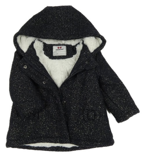 Tmavomodro-zlatý melírovaný úpletový zateplený kabát s kapucňou orchestra