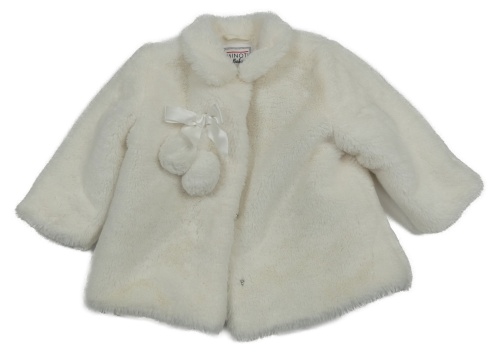 Smotanový kožušinový zateplený kabát s mašlou a bambulkami a golierikom MINOTI