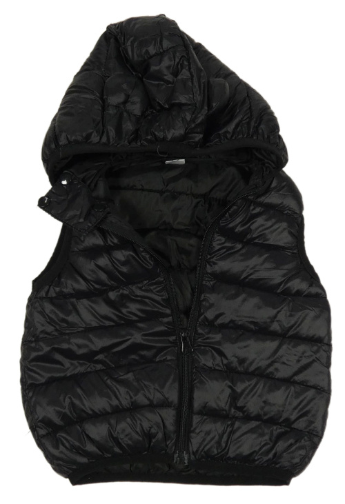 • Čierna prešívaná šušťáková zateplená vesta s kapucňou s uškami