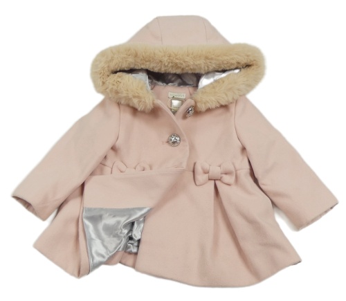 • Ružový flaušový podšitý kabát s mašľami a kapucňou s kožešinou Monsoon